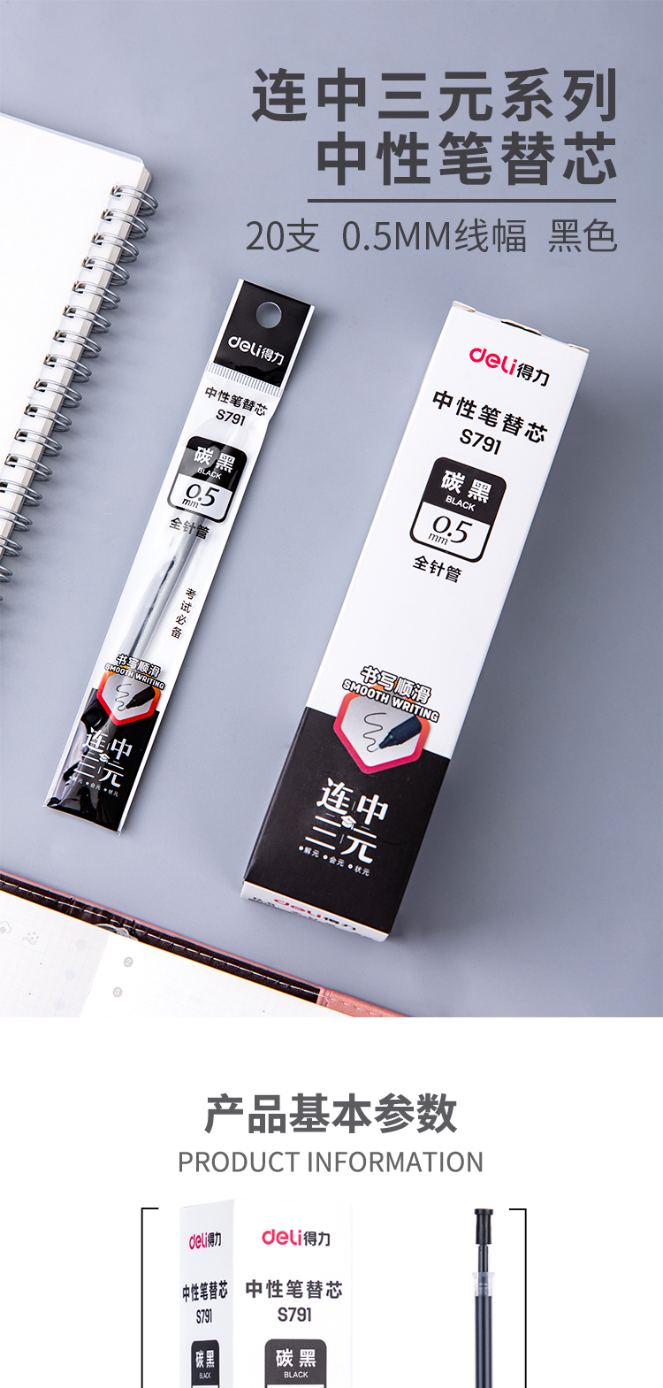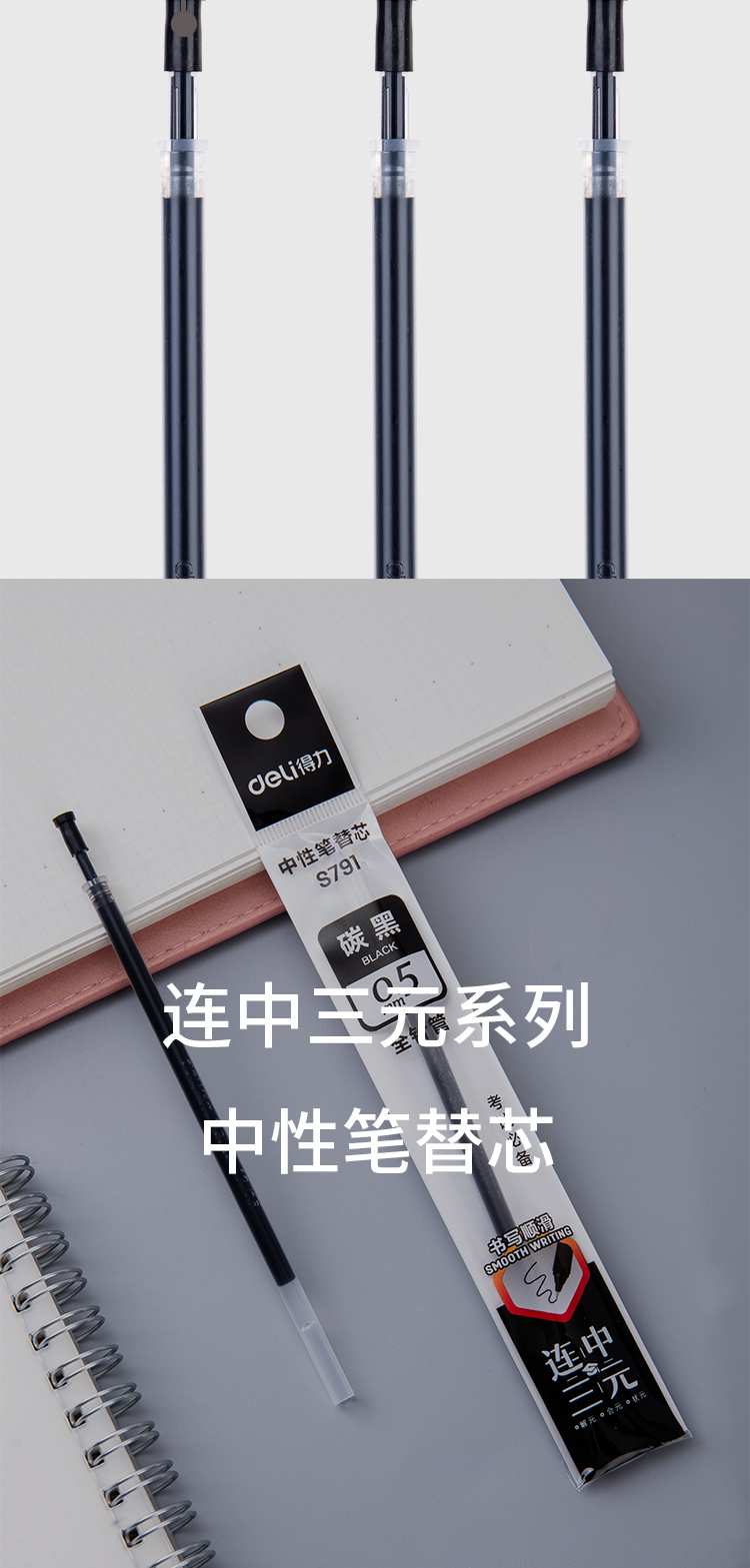 得力(deli)S791 全針管簽字筆芯 黑色中性筆芯 20支/盒