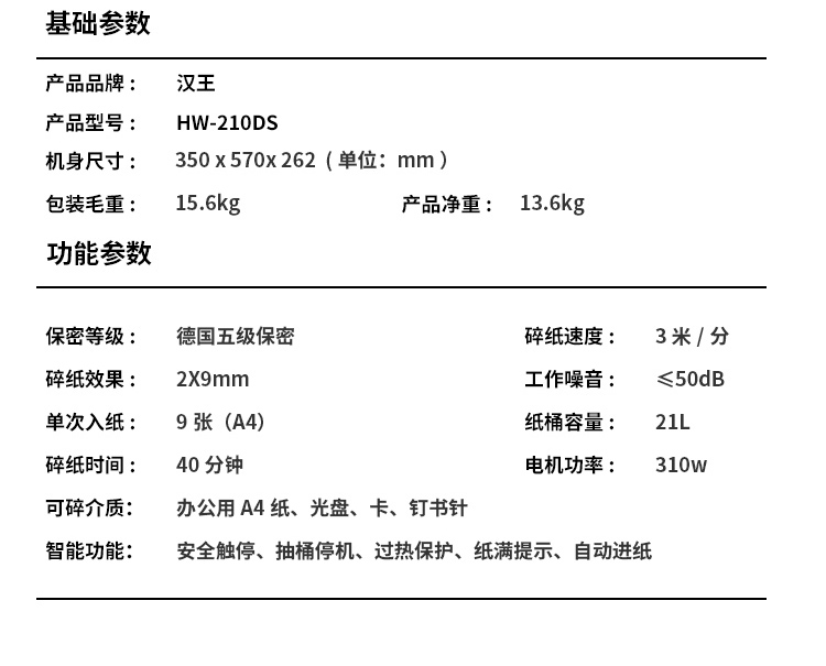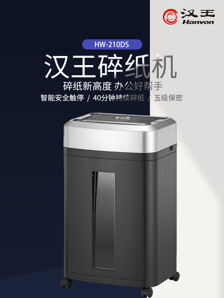 漢王(Hanvon)HW-210DS德國(guó)5級(jí)高保密碎紙機(jī) 辦公商用 自動(dòng)進(jìn)紙長(zhǎng)時(shí)間碎卡碎光盤紙張粉碎機(jī)