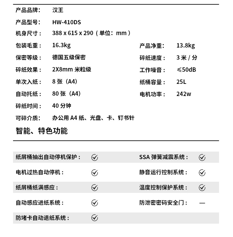 漢王(Hanvon)HW-210DS德國(guó)5級(jí)高保密碎紙機(jī) 辦公商用 自動(dòng)進(jìn)紙長(zhǎng)時(shí)間碎卡碎光盤(pán)紙張粉碎機(jī)