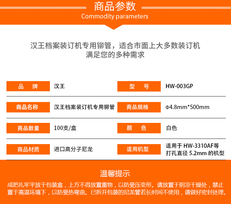 漢王(Hanvon)HW-003GP手動財務(wù)裝訂機專用透明裝訂鉚管Φ4.8*500mm 100支/盒裝熱熔管