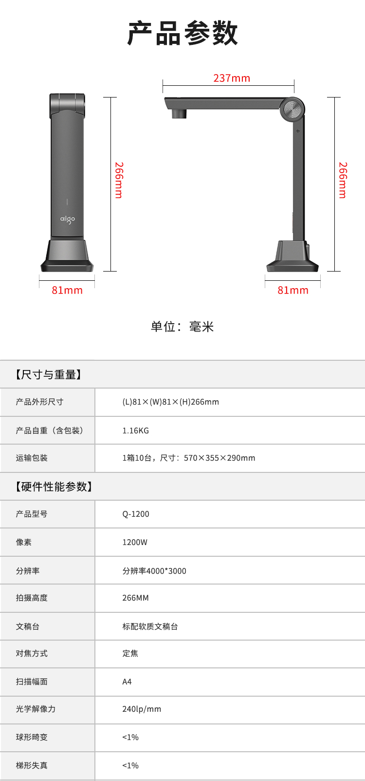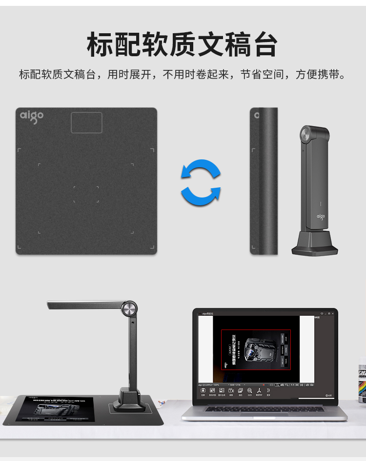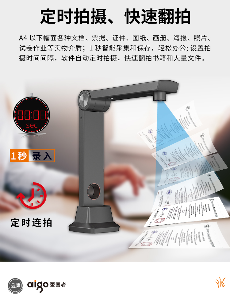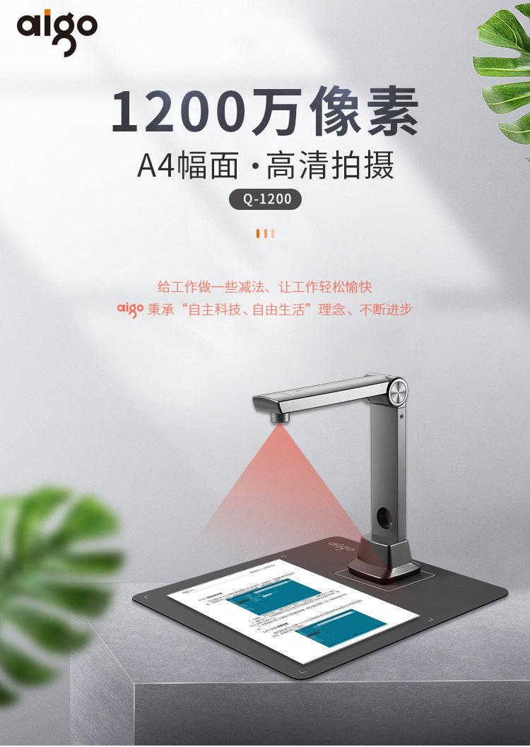 愛國者(aigo)Q-1200高拍儀掃描儀高速掃描文檔試卷資料檔案速拍儀1200萬高清像素單攝像A4幅面可折疊送軟底