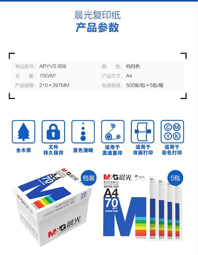 晨光(M&G)紅晨光70g A4復印紙 500張/包 5包/箱(2500張) APYVS957