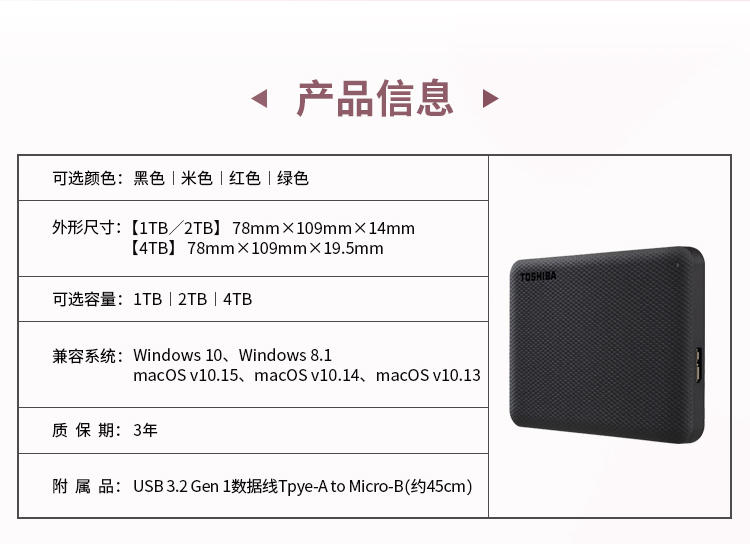 東芝(TOSHIBA) 4TB 移動(dòng)硬盤(pán) V10系列 USB3.0 2.5英寸 墨黑 兼容Mac 超大容量 密碼保護(hù) 輕松備份 高速傳輸