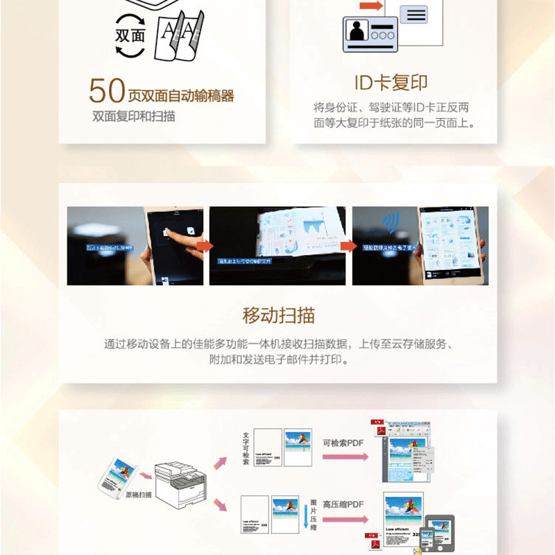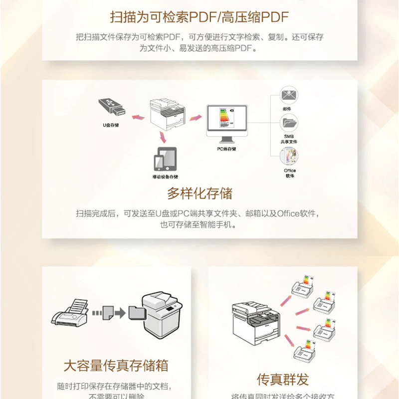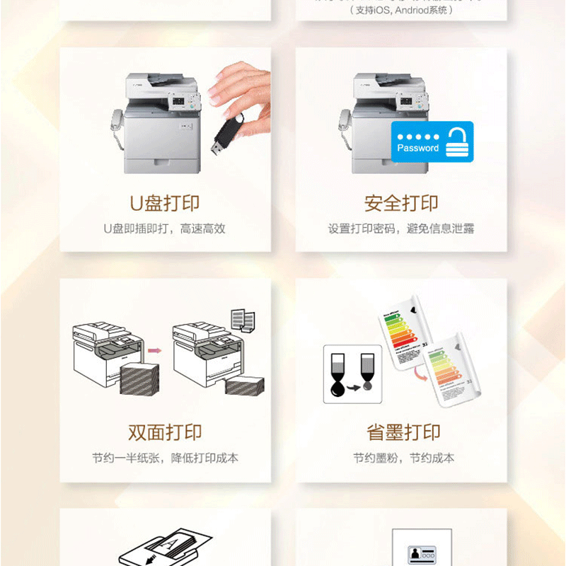 3.5英寸彩色觸摸屏,25頁/分鐘彩色黑白同速,50頁雙面自動輸稿器、標(biāo)配網(wǎng)絡(luò)打印掃描功能 ?
