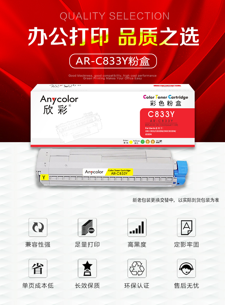 欣彩 OKI C833粉盒 AR-C833Y黃色