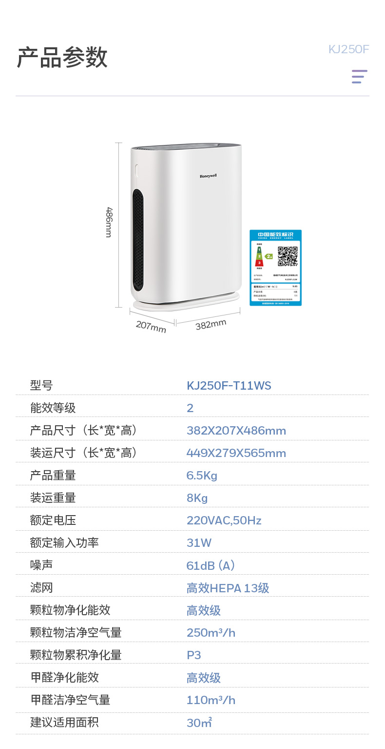 霍尼韋爾(Honeywell) KJ250F-T11WS空氣凈化器 寵物家庭除甲醛除異味除過敏原除塵螨