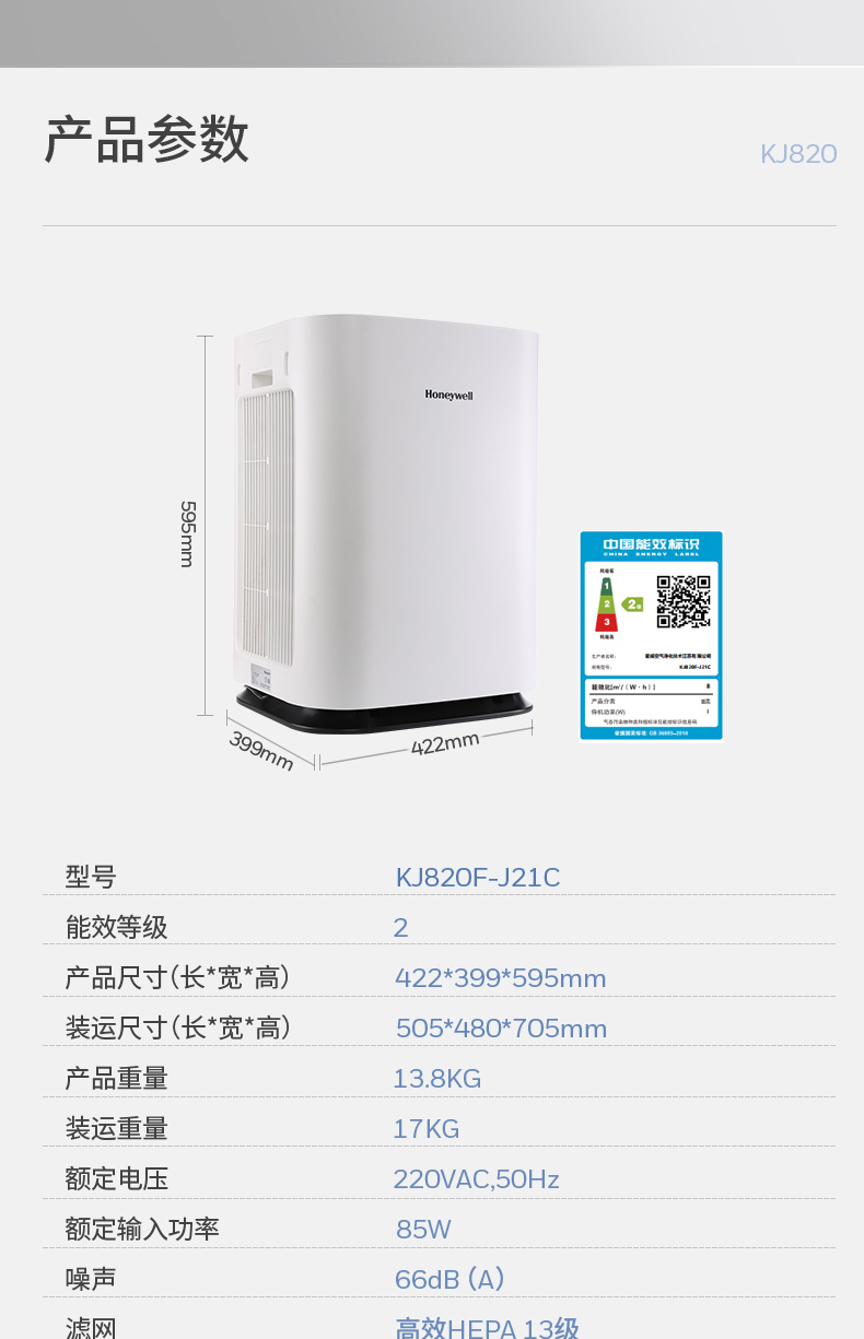 霍尼韋爾(Honeywell) KJ820F-J21C空氣凈化器 室內凈化除甲醛除菌 新房辦公室凈化器