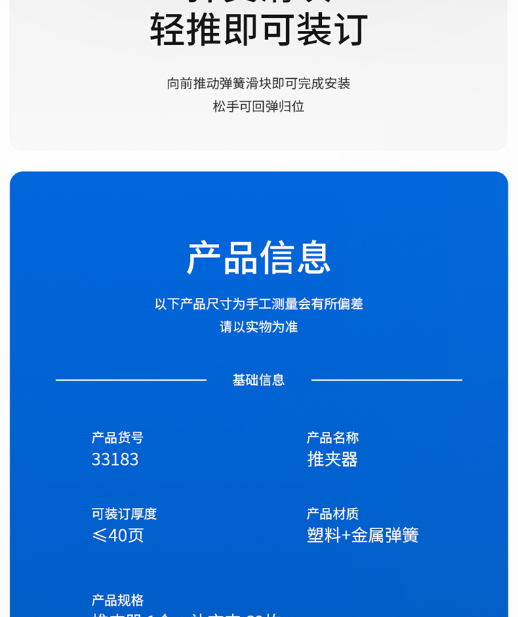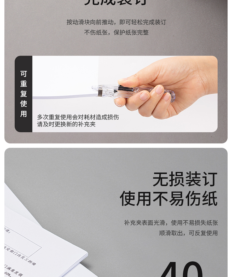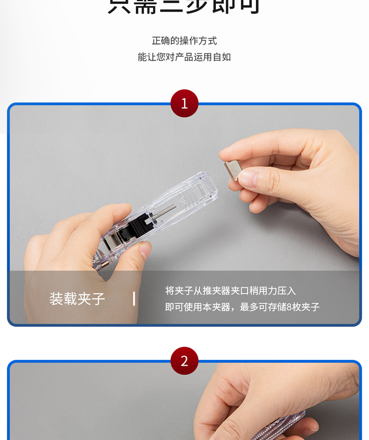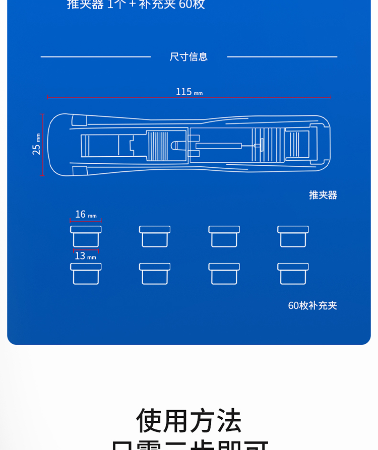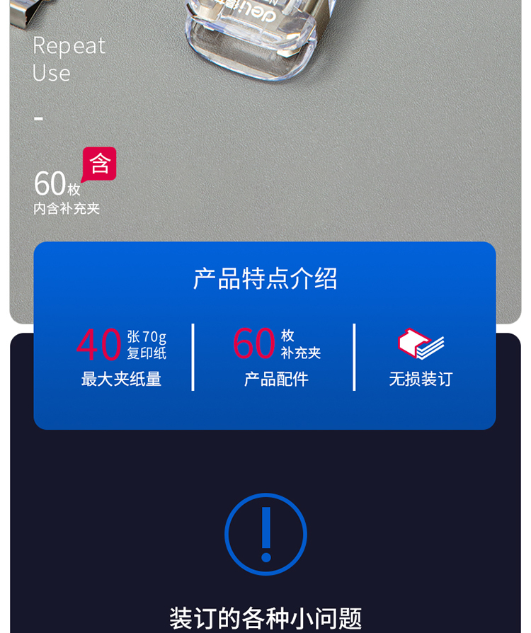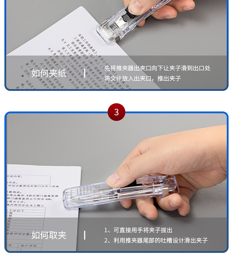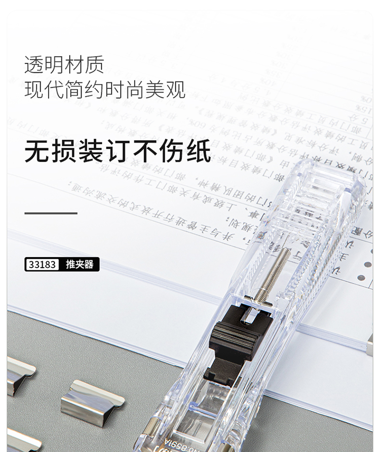 得力(deli)辦公裝訂推夾器套裝(推夾器+60枚補(bǔ)充夾) 可夾紙張數(shù)40張 透明白33183