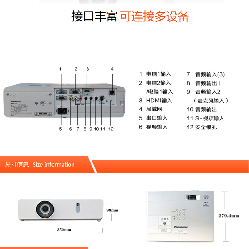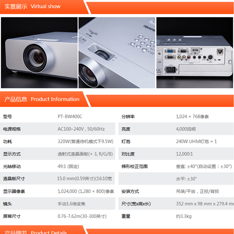 松下(panasonic) PT-BW400C 商務(wù)辦公投影機 高清寬屏 4000流明 12000:1