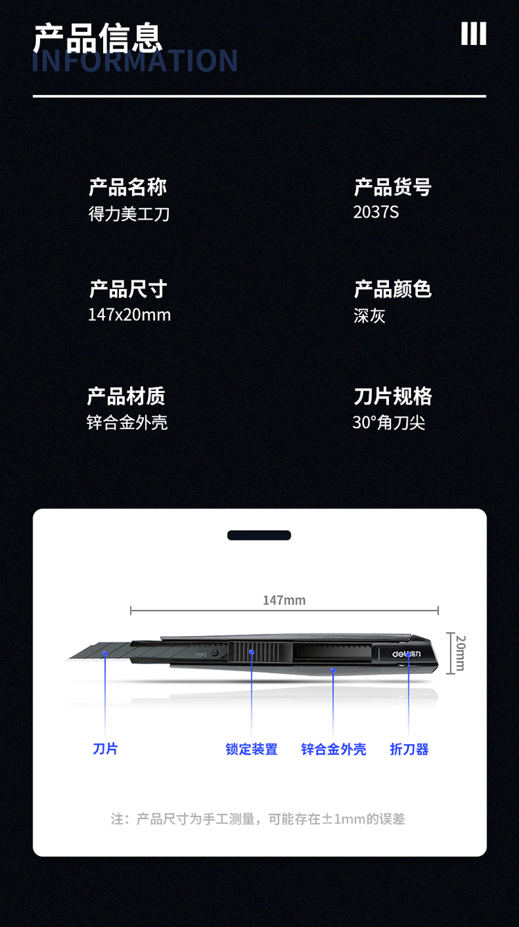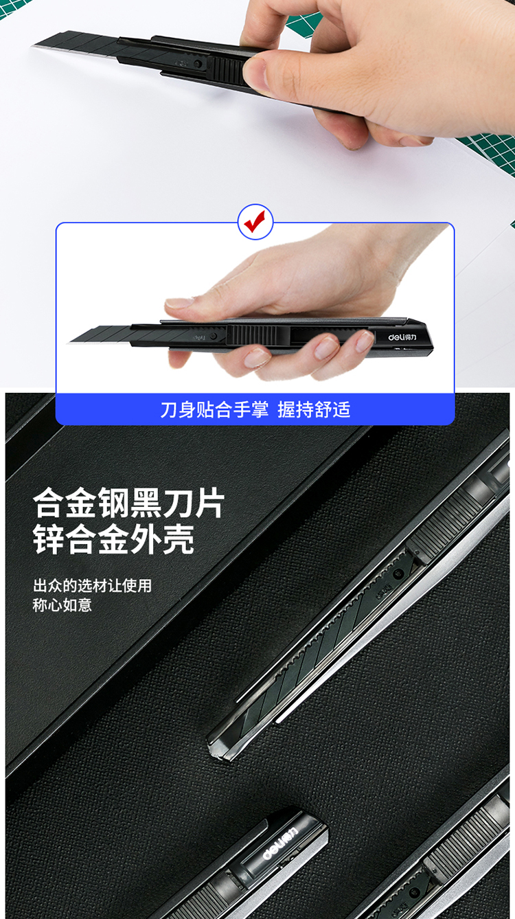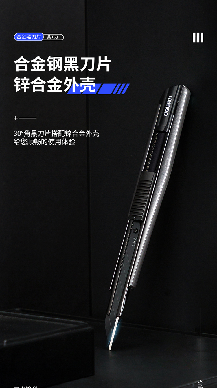 得力(deli)小號30°黑刀刃鋅合金美工刀/裁紙刀/壁紙刀 2037S