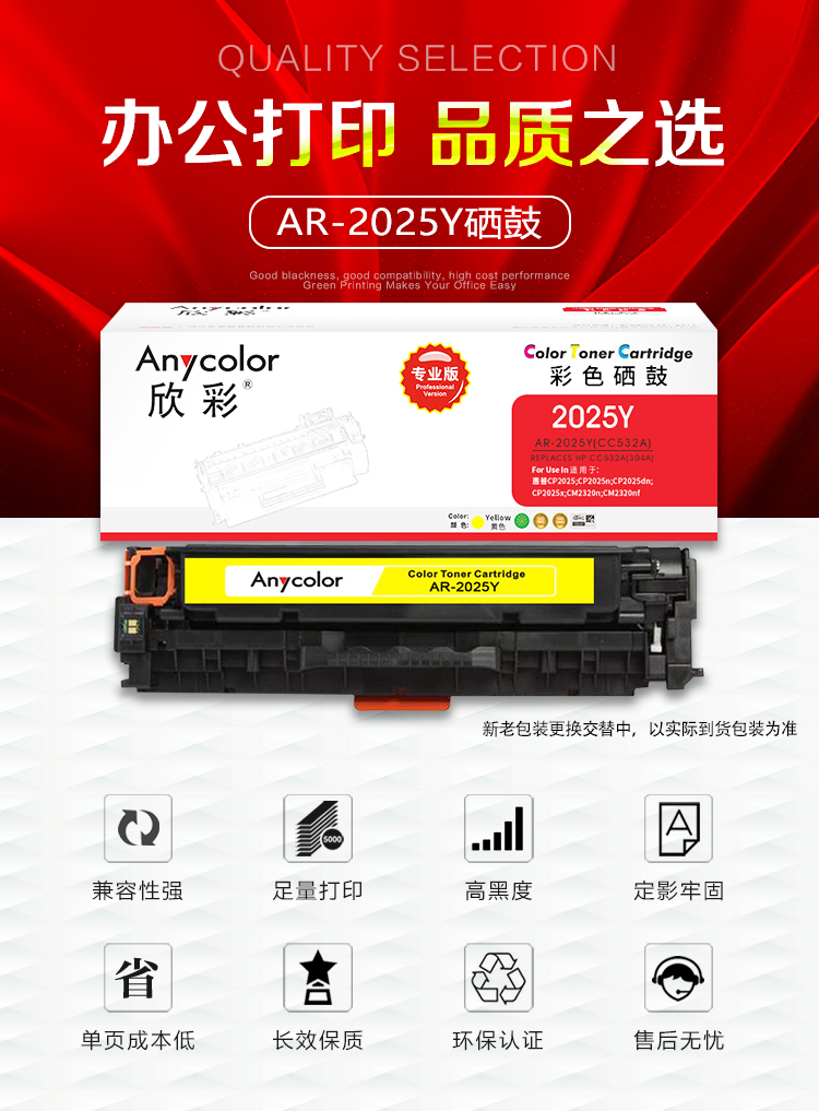 欣彩(Anycolor)AR-2025Y(專業(yè)版)CC532A黃色硒鼓 304A 適用惠普HP Color LaserJet CP2025 2320