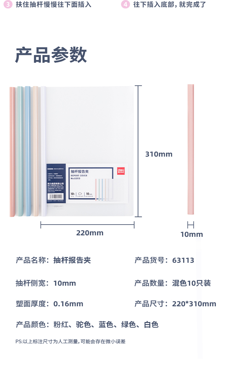 得力(deli)10只A4透明拉桿夾 5色裝33321