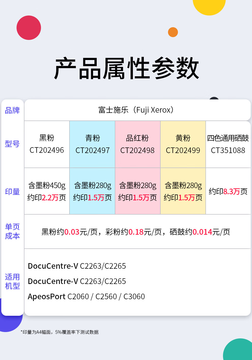 富士施樂(Fuji Xerox)VC2263/C2060/C3060/C2560五代VC2265原裝粉盒黃色墨粉CT202499可印16000張
