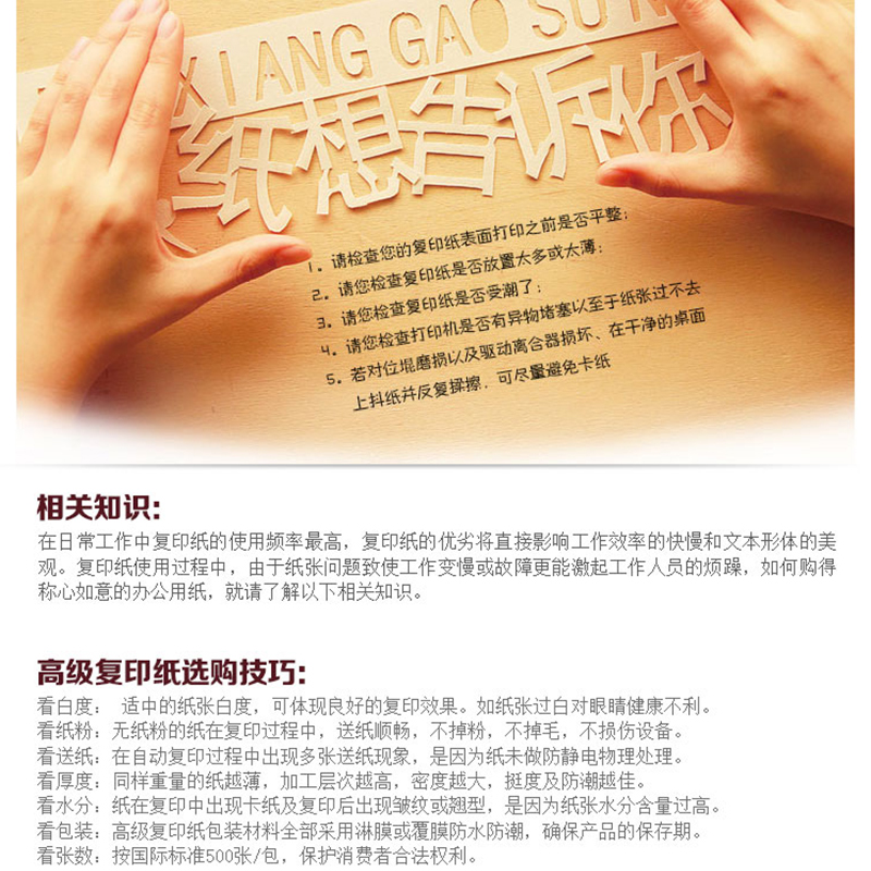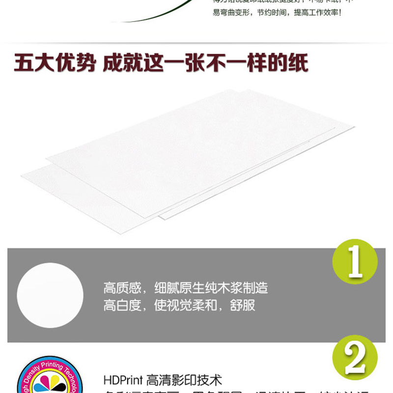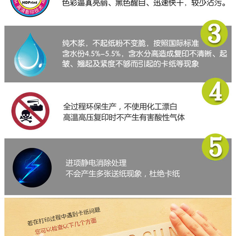 采用先進(jìn)的紙張表面處理劑,噴墨打印效果和不化水性,經(jīng)過專業(yè)復(fù)印機(jī)高速測試,卷曲度小,卡紙率極低,裁切質(zhì)量和張數(shù)可以自動(dòng)控制,保證每包500張,不缺紙短紙 ?