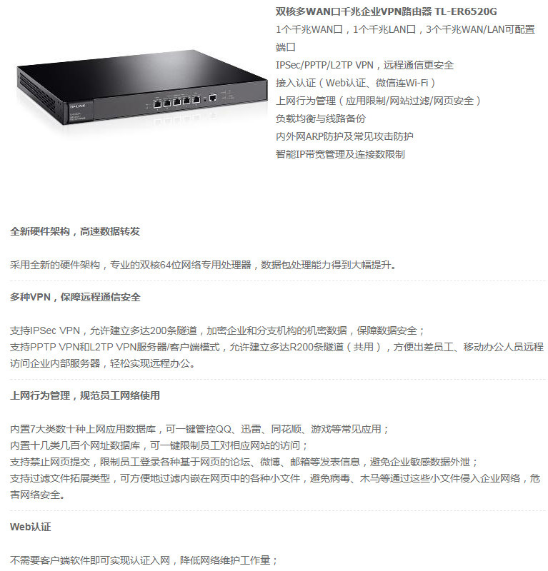普聯(lián)(TP-LINK) TL-ER6520G 企業(yè)級千兆有線路由器 防火墻/VPN/上網(wǎng)行為管理