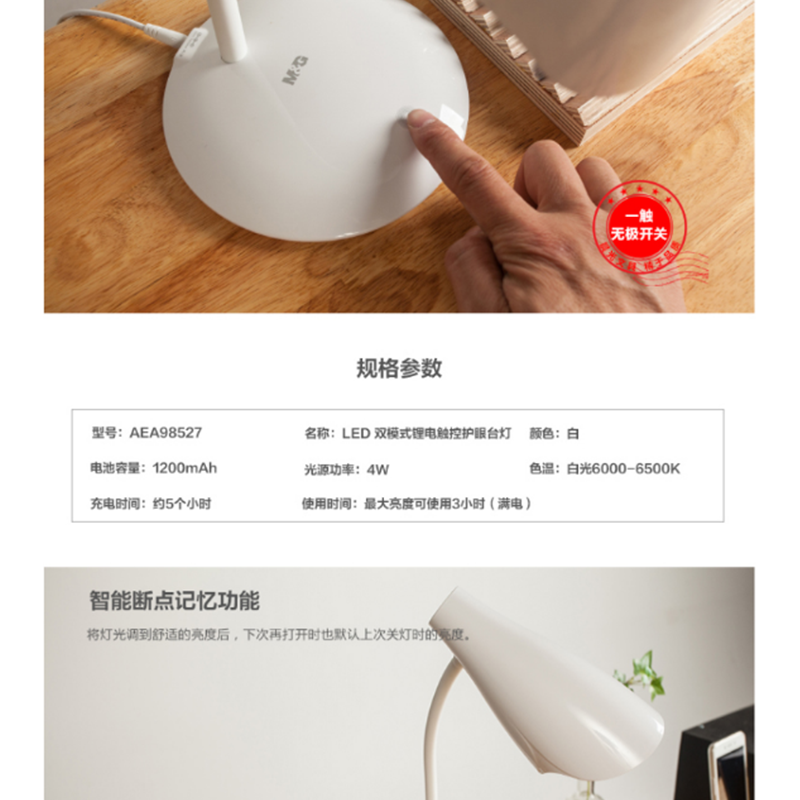晨光(M&G) AEA98527 臺燈LED雙模式鋰電觸控護(hù)眼