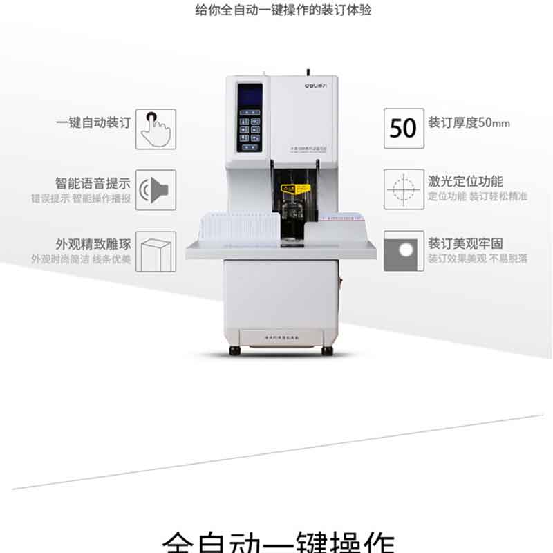 激光裝訂,全自動一鍵裝訂,裝訂過程語音提示,裝訂厚度≤50mm,憑證單據裝訂輕松搞定! ?