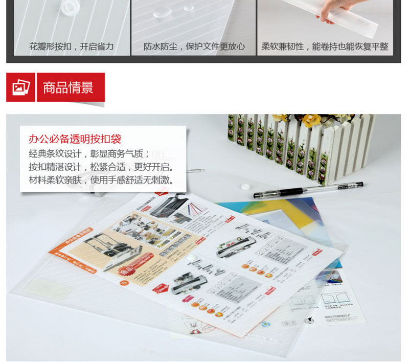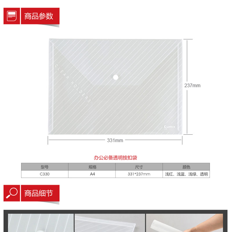 齊心(COMIX) C335 A4辦公必備透明按扣袋 白色