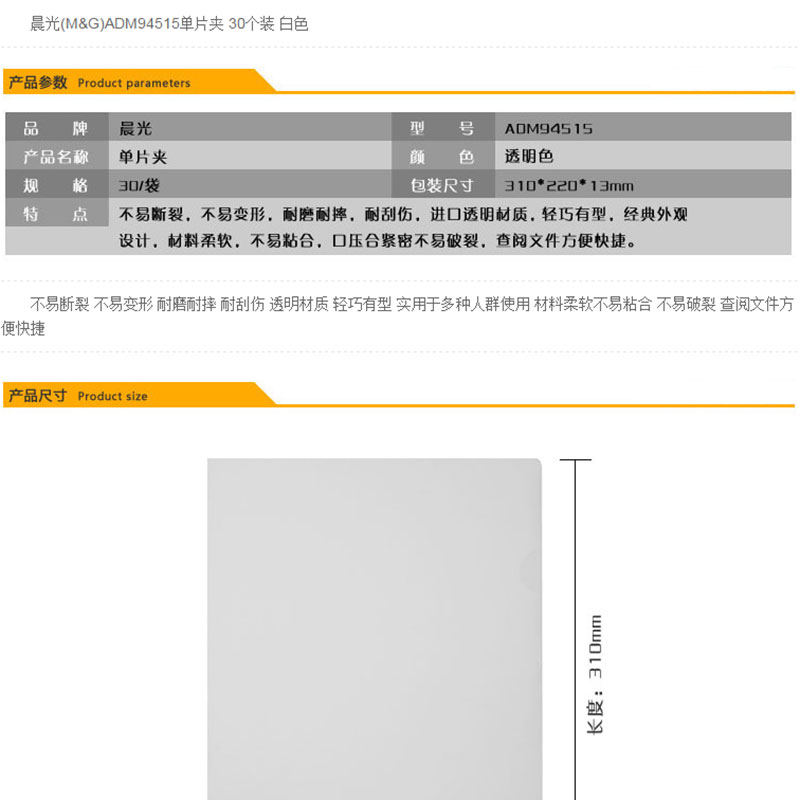 晨光(M&G) ADM94515 A4透明文件套單片夾 30個/包