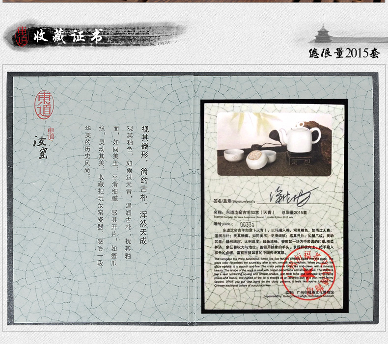 以瑪瑙入釉,觀其釉色,如雨過天青,溫潤古樸。撫其釉面,如同美玉,平滑細(xì)膩。附帶收藏證書。 ?