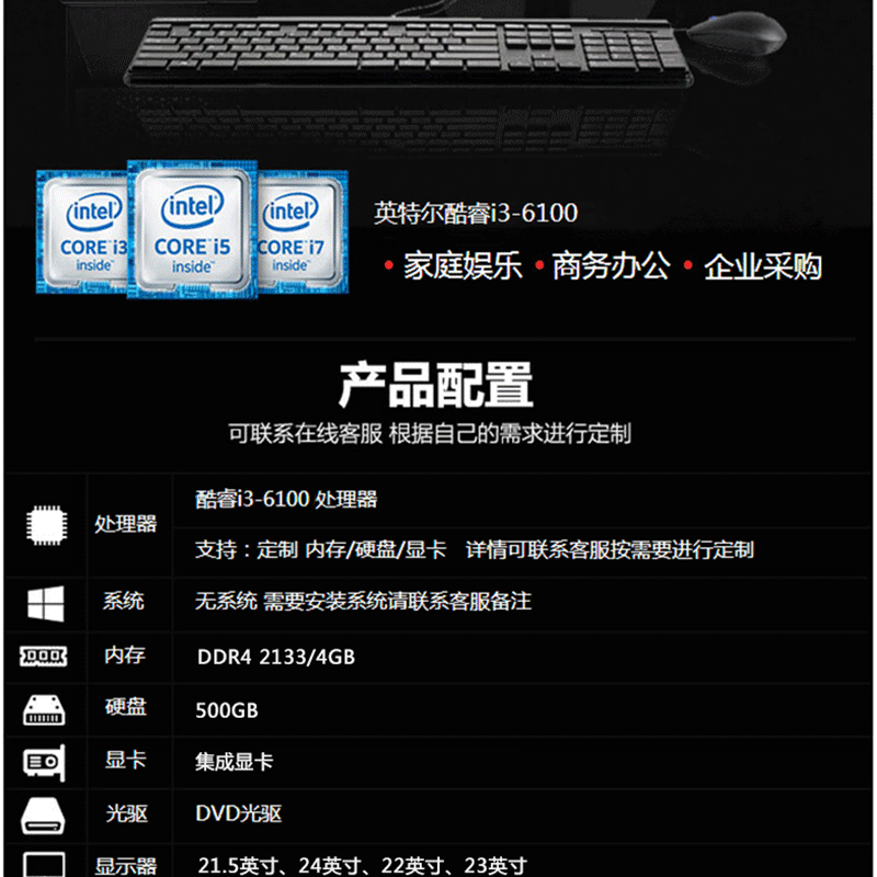 • i3-6100/4G/500G/21.5英寸 i3-6100/4G/500G/24英寸 i3-6100/4G/500G/22英寸 i3-6100/4G/500G/23英寸 i3-6100/4G/1T/21.5英寸/集顯 i3-6100/4G/1T/24英寸/集顯 i3-6100/4G/1T/22英寸/集顯 i3-6100/4G/1T/23英寸/集顯 i3-6100/8G/1T/21.5英寸/獨(dú)顯 i3-6100/8G/1T/24英寸/獨(dú)顯 i3-6100/8G/1T/22英寸/獨(dú)顯 i3-6100/8G/1T/23英寸/獨(dú)顯