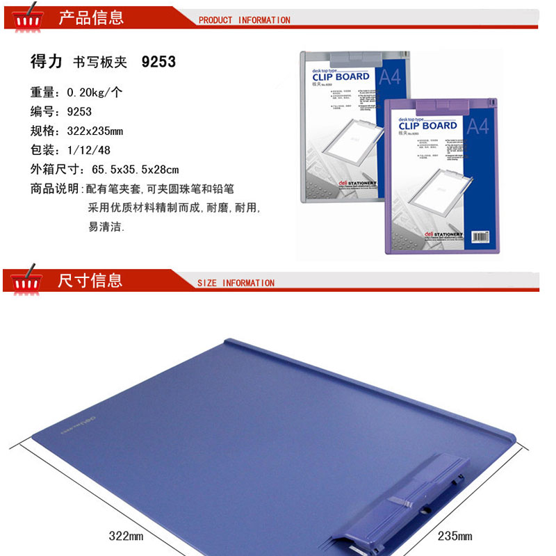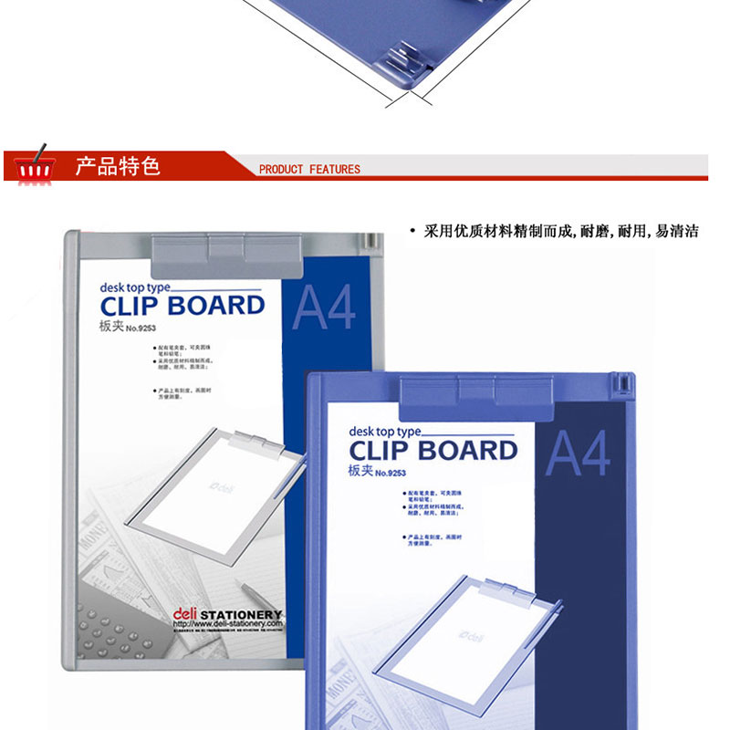得力(deli) 9253 塑料書寫板夾適用于A4紙 顏色隨機(jī)