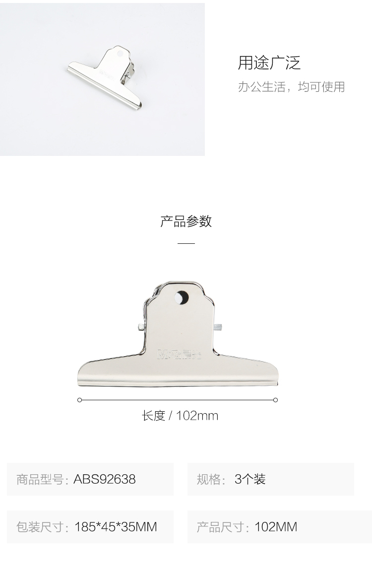 晨光(M&G) ABS92638 2#山形金屬不銹鋼票據(jù)夾 102mm(ABS92638/3只袋 )