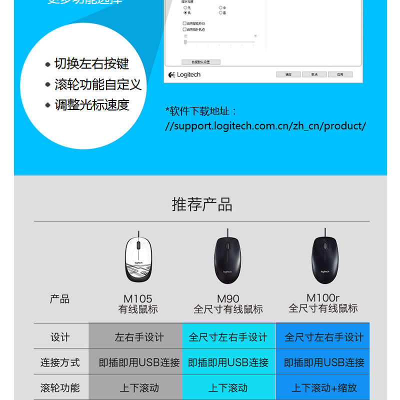 羅技(Logitech) M105 時尚多彩鼠標 左右手通用 (活力藍)