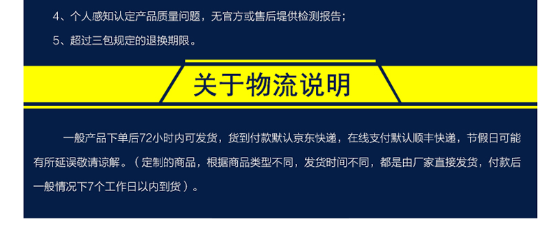 • 應(yīng)客戶的要求、特別定制的商品,如直送定單、代客戶采購等商品,無質(zhì)量問題不可退換貨。