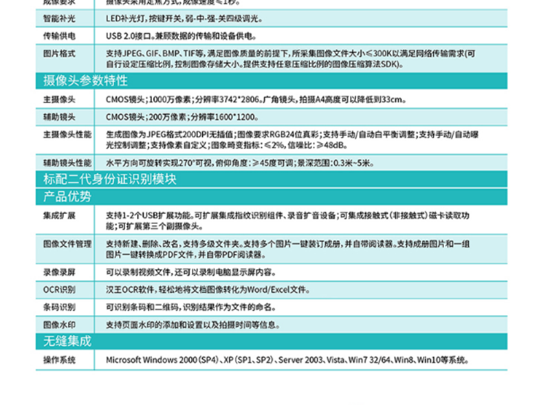 三年質(zhì)保、可集成擴(kuò)展、支持一鍵證件合成、可識(shí)別條碼和二維碼、支持頁(yè)面水印添加、可錄像錄屏、一鍵Word或PDF ?
