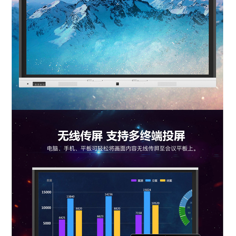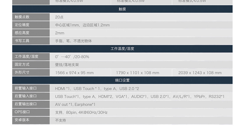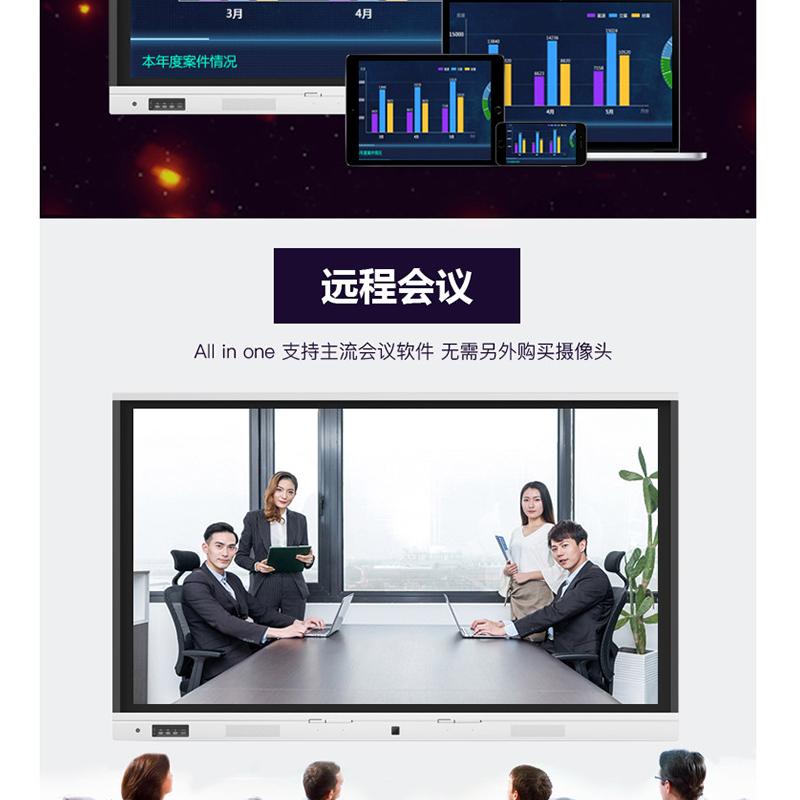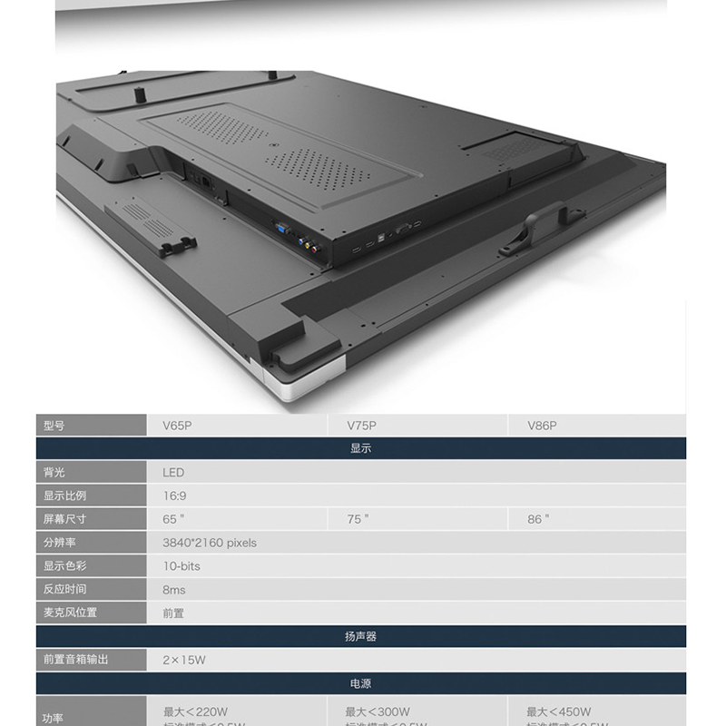 屏幕分辨率3840*2160,20點紅外觸控(平蛙技術),鋼化玻璃,壁掛支架,內置拾音麥、4K高清攝像頭,windows系統(tǒng),I5 CPU,8G內存,256G存儲,newline助手軟件 ?