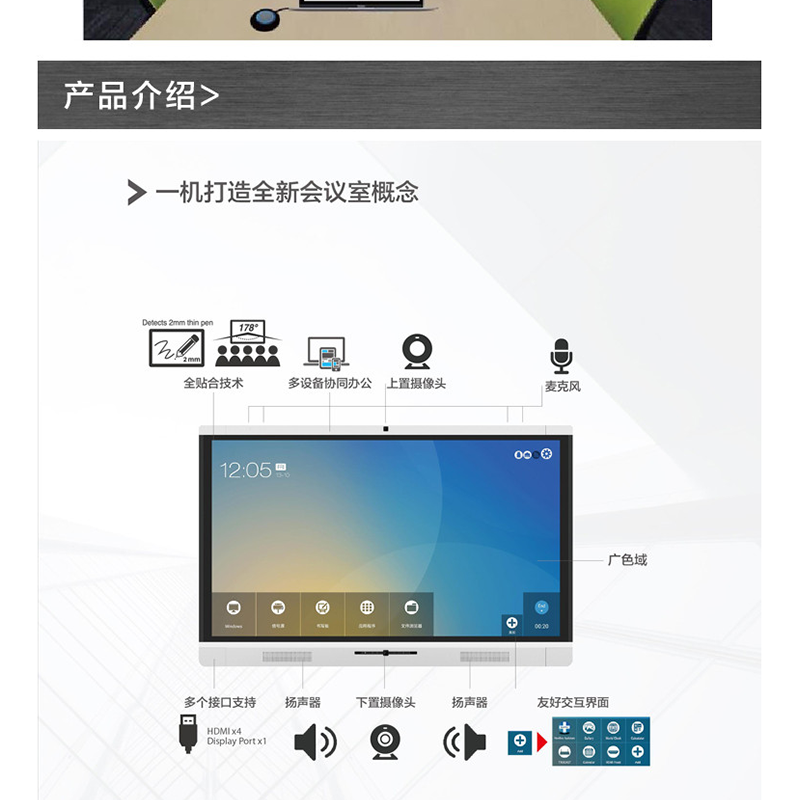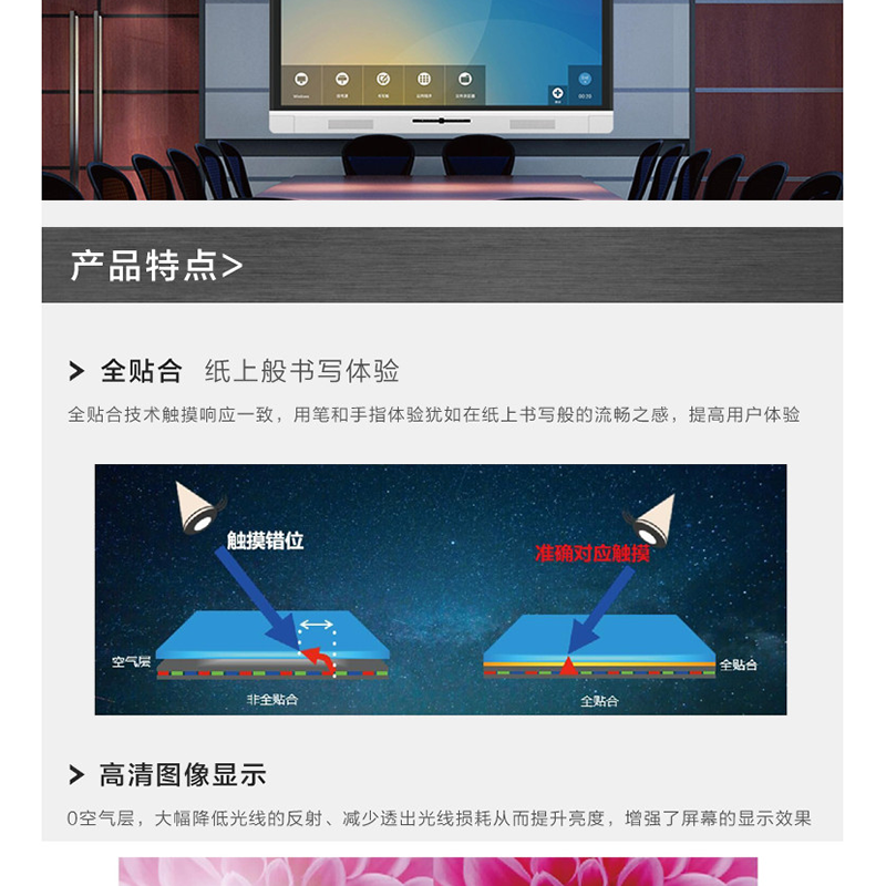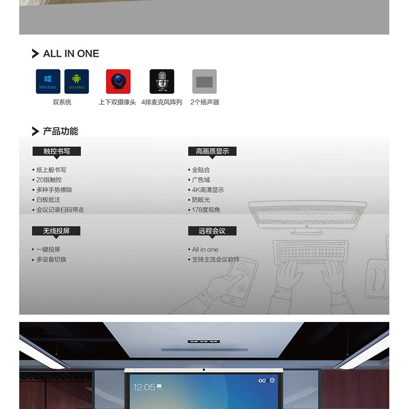 屏幕分辨率3840*2160,廣色域,20點(diǎn)紅外觸控(平蛙技術(shù)),鋼化玻璃,全貼合工藝,壁掛支架,安卓系統(tǒng)、2G內(nèi)存、8G存儲(chǔ),windows系統(tǒng),I5 CPU,8G內(nèi)存,256G存儲(chǔ),內(nèi)置拾音麥、雙高清攝像頭,newline助手軟件 ?