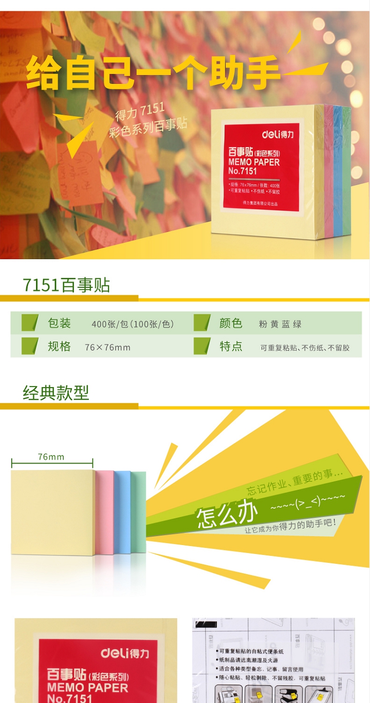 得力(deli) 7151 彩色系列百事貼/便簽紙 4色裝 76*76mm