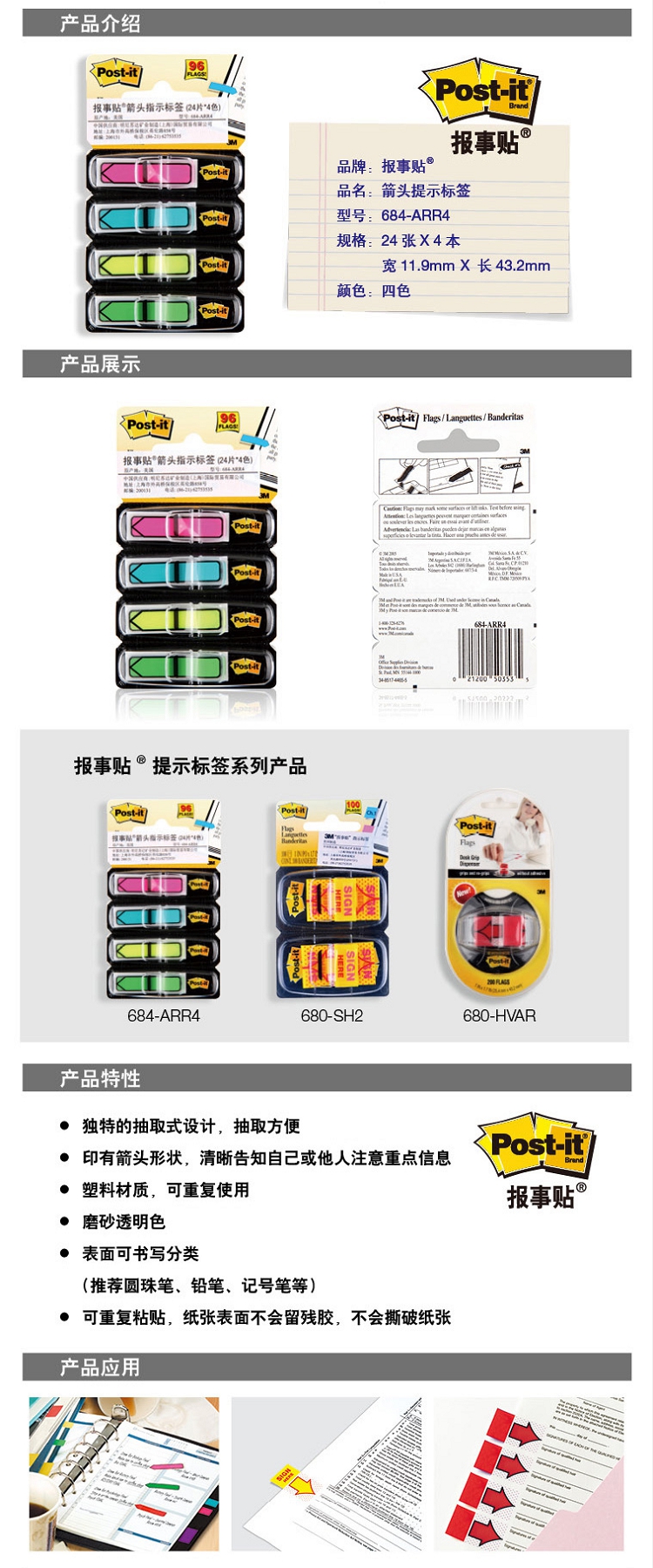 3M(Post-it) 684-ARR4 箭頭指示標(biāo)簽/報(bào)事貼 24片*4色/包
