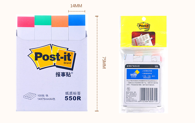 3M(Post-it) 550R 報(bào)事貼/指示標(biāo)簽/分頁(yè)標(biāo)簽 14×75mm 100張*4色/包