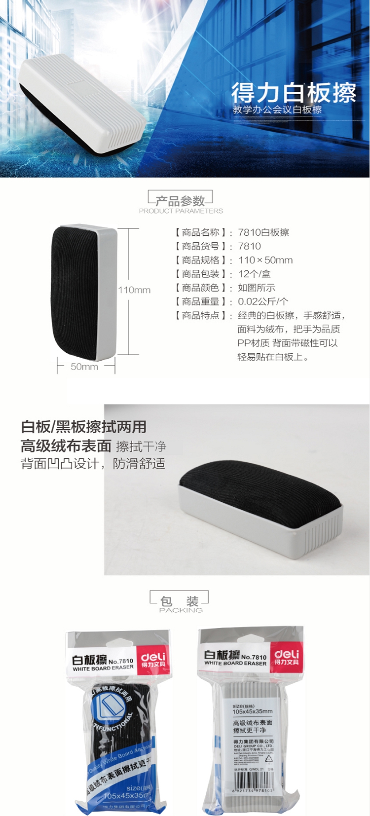 得力(deli) 7834 白板磁性白板擦、正面吸附(50*125*25mm)