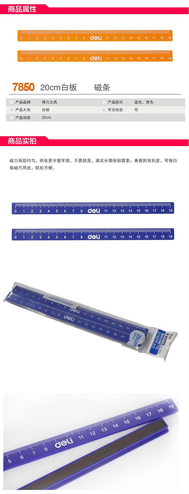 得力(deli) 7850 磁條 20mm量程直尺 白板尺 磁性直尺 顏色隨機(jī)