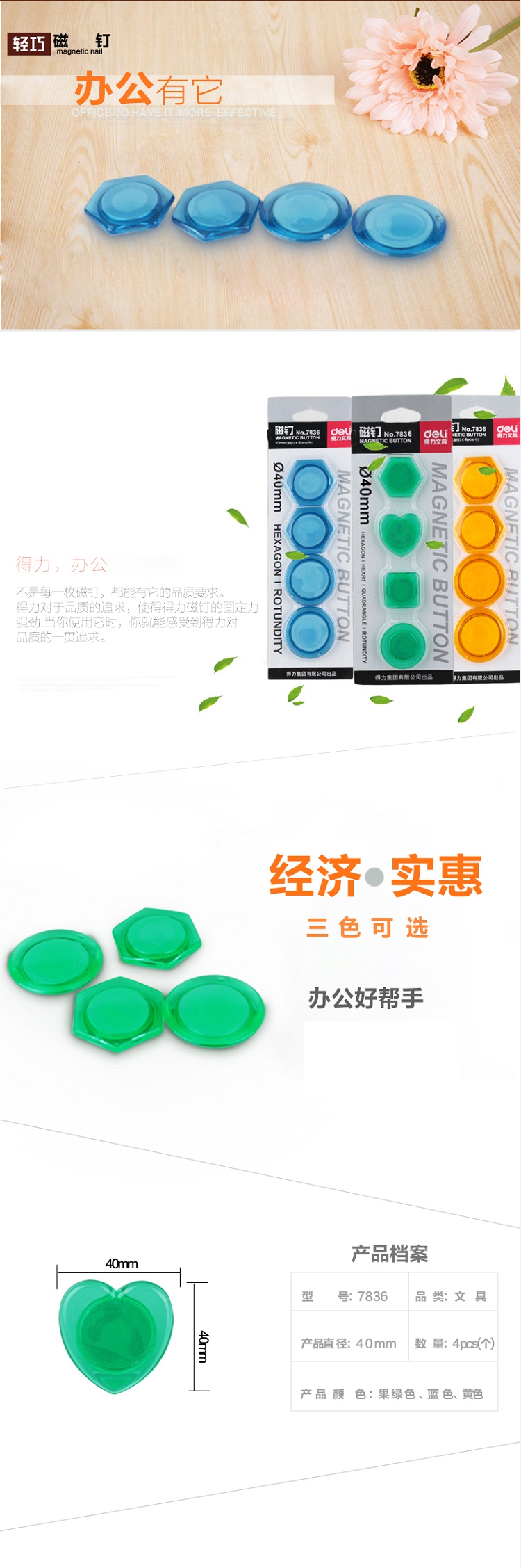 得力(deli) 7836 白板磁扣/吸鐵石/磁粒 磁力強(qiáng) 40mm