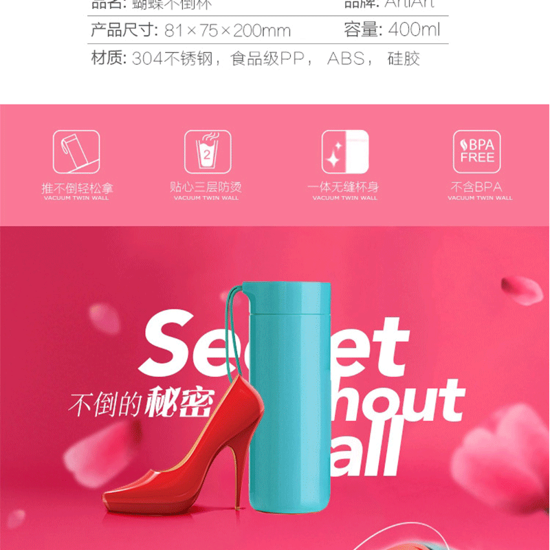 Artiart DRIN032 便攜不倒杯運(yùn)動(dòng)水杯 蝴蝶保溫不倒杯400ml(紅色)