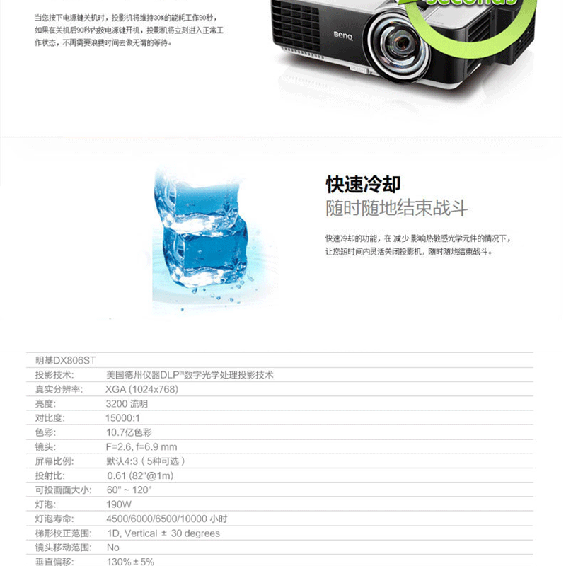 明基(BenQ) DX806ST 辦公短焦投影儀(DLP芯片 3200流明 XGA分辨率 HDMI)(吊裝)