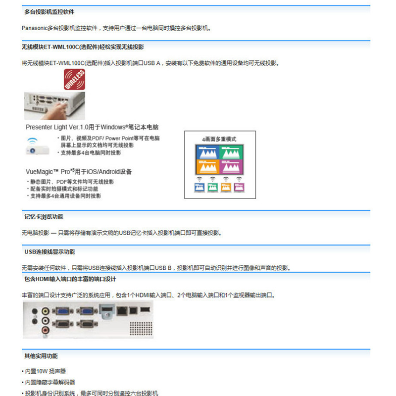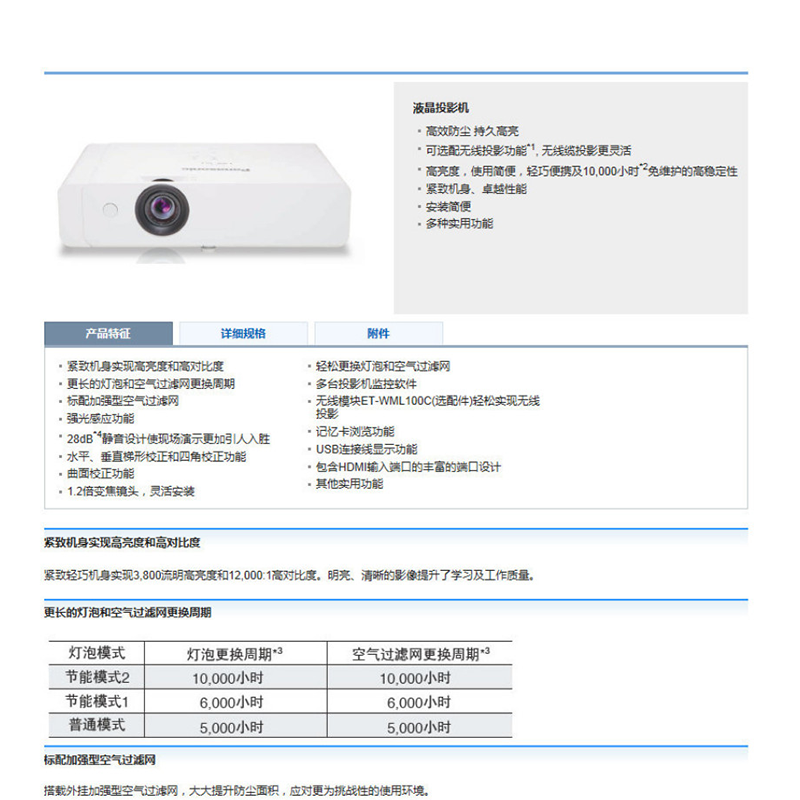 可選配件 高天花板吊架ET-PKL100HC,低天花板吊架ET-PKL100SC,支架組件ET-PKL420BC,D-SUB/S-視頻轉(zhuǎn)換線ET-ADSVC,替換過濾網(wǎng)單元ET-RFL310C,替換燈泡單元ET-LAL500C,無線模塊ET-WML100C 其他功能 強(qiáng)光感應(yīng)功能,曲面校正功能,輕松更換燈泡和空氣過濾網(wǎng),多臺(tái)投影機(jī)監(jiān)控軟件,標(biāo)配加強(qiáng)型空氣過濾網(wǎng)