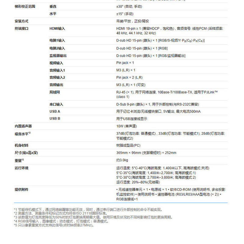 重量(kg) 約3kg 標(biāo)準(zhǔn)配件 無線遙控器單元×1,電源線×1,軟件CD-ROM(使用說明書, 多臺(tái)投影機(jī)監(jiān)控軟件),使用說明書,遙控器電池(R03/LR03/AAA型電池×2),RGB連接線×1