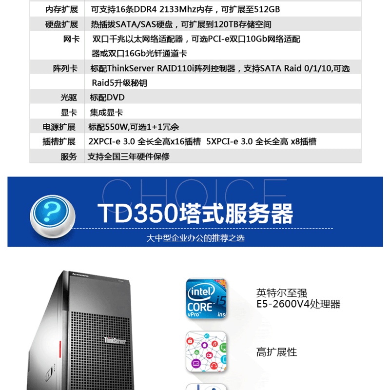 聯(lián)想(ThinkServer) TD350(E5-2620V4) 塔式服務(wù)器 8GB/300G固態(tài)盤/DVD/2路