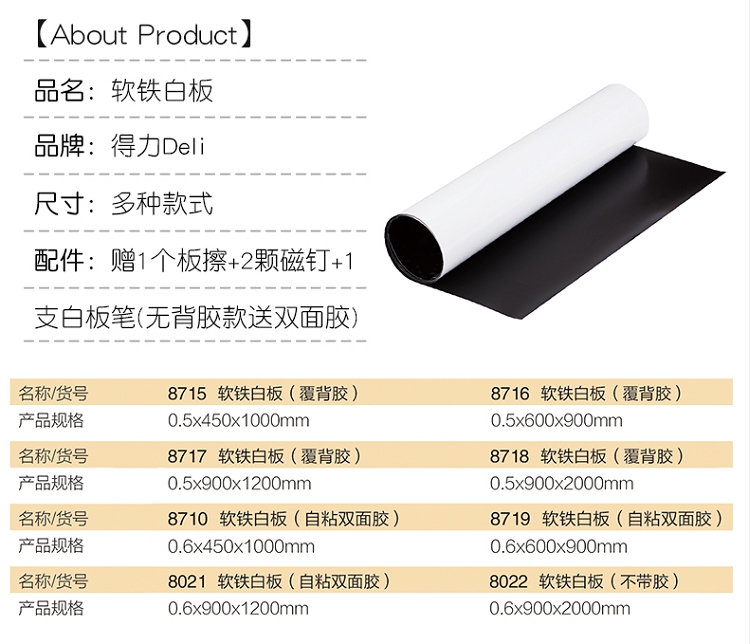 得力(deli) 8710 磁性軟白板墻貼掛式辦公家用軟鐵白板0.6*450*1000mm(無膠)