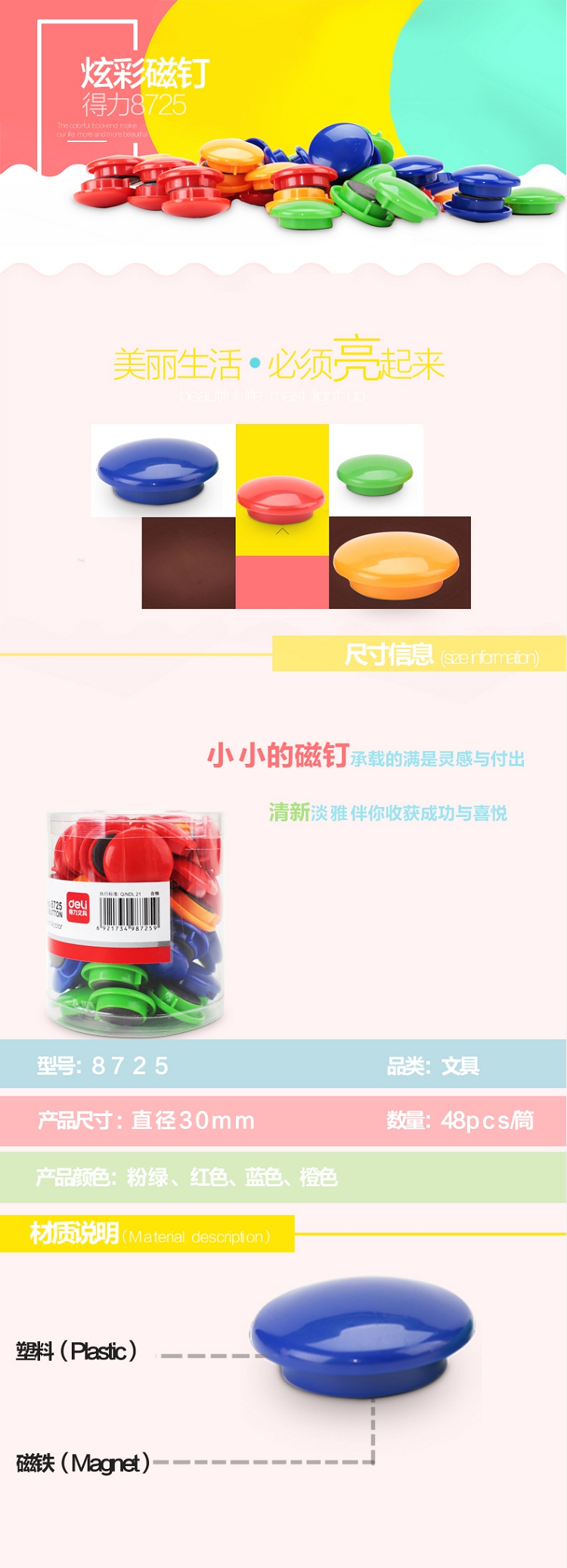 得力(deli)彩色白板磁釘黑板吸鐵石/磁鐵φ30mm 48粒/筒8725