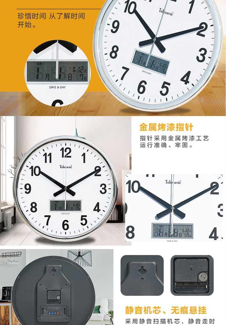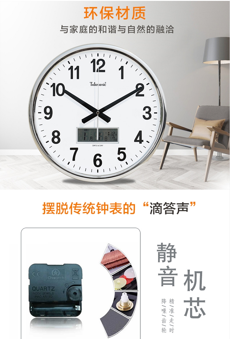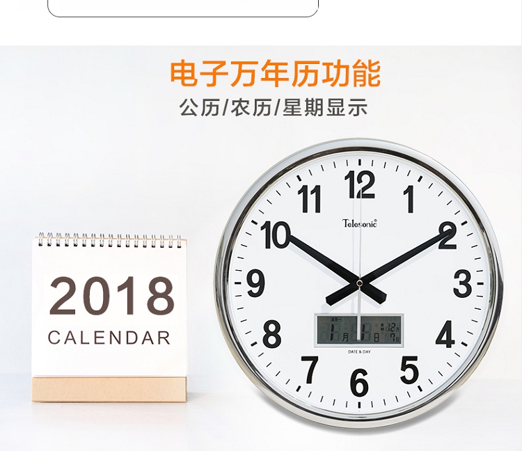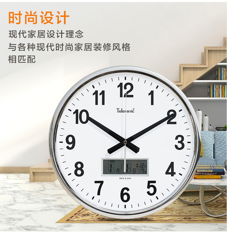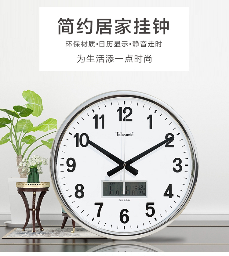 天王星(Telesonic) SLCD333 14英寸靜音掛鐘客廳創(chuàng)意萬(wàn)年歷掃描石英掛鐘/鍍銀