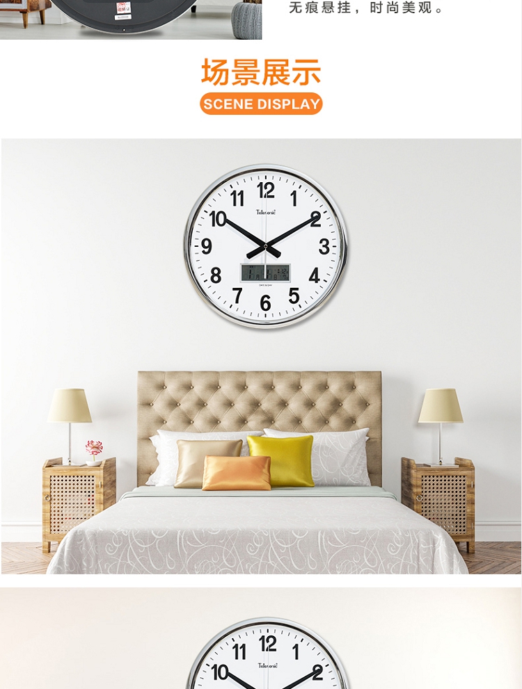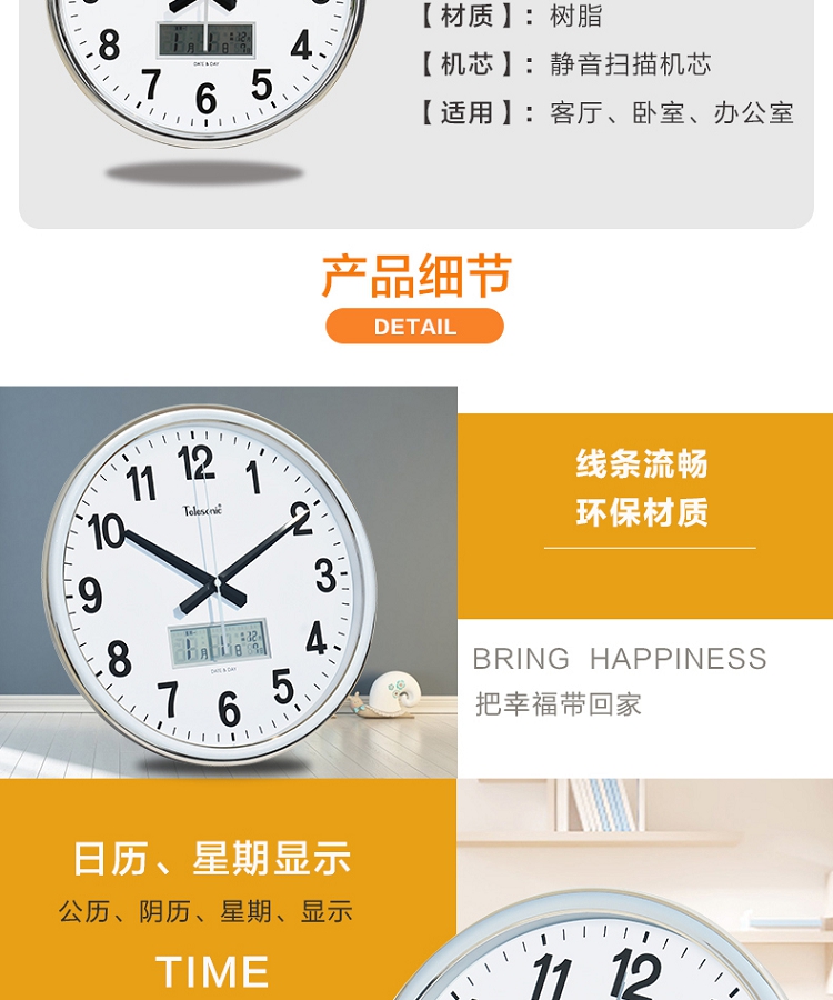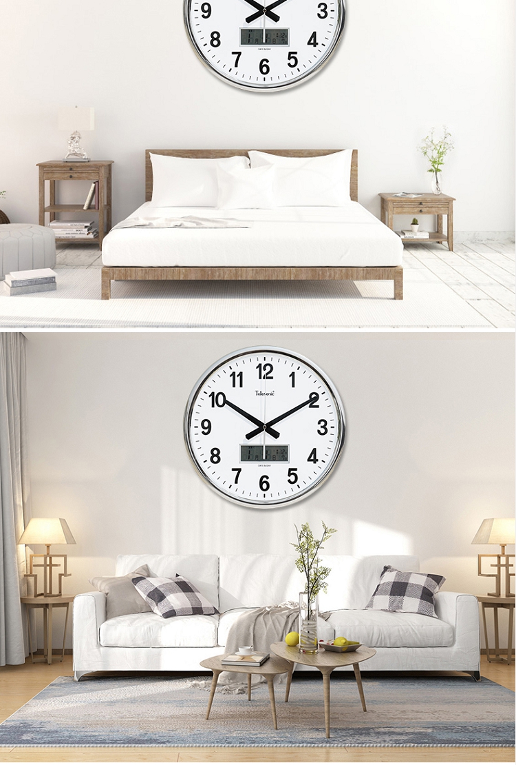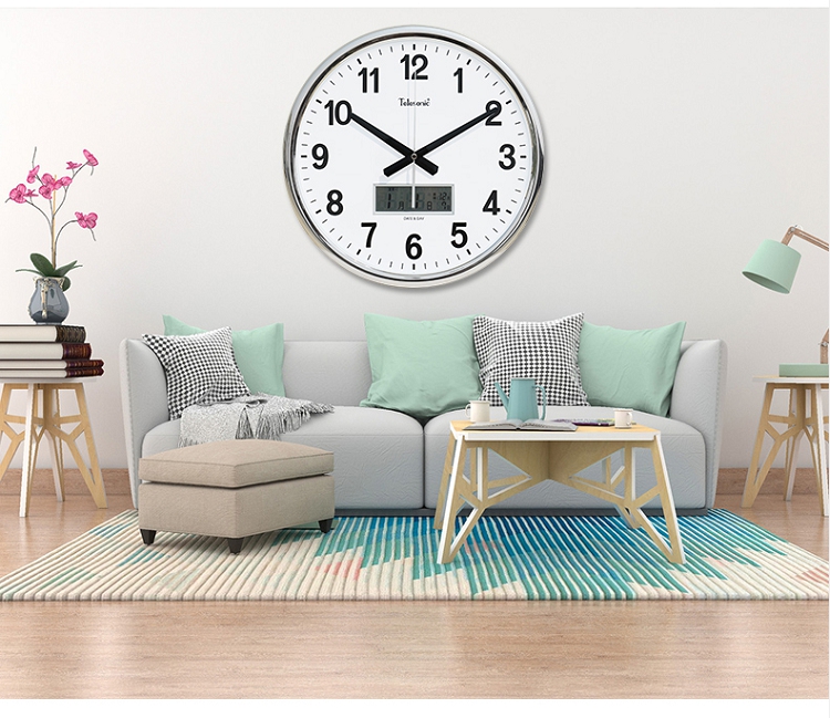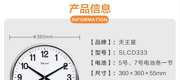 天王星(Telesonic) SLCD333 14英寸靜音掛鐘客廳創(chuàng)意萬(wàn)年歷掃描石英掛鐘/鍍銀