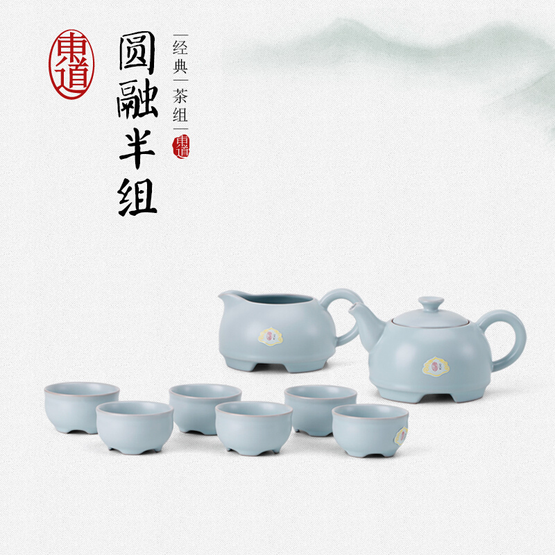東道汝窯 功夫茶具套裝 圓融茶壺半組/1壺1海6杯(天青色)